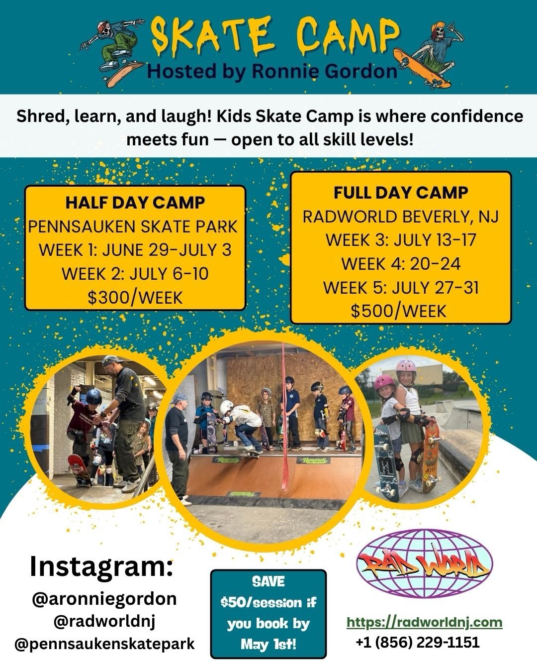 Veteran Pro Skateboarder Ronnie Gordon is back for another fun and action packed camp to get you skaters rolling! Best value of the summer with a true Pro through and through! Book today!